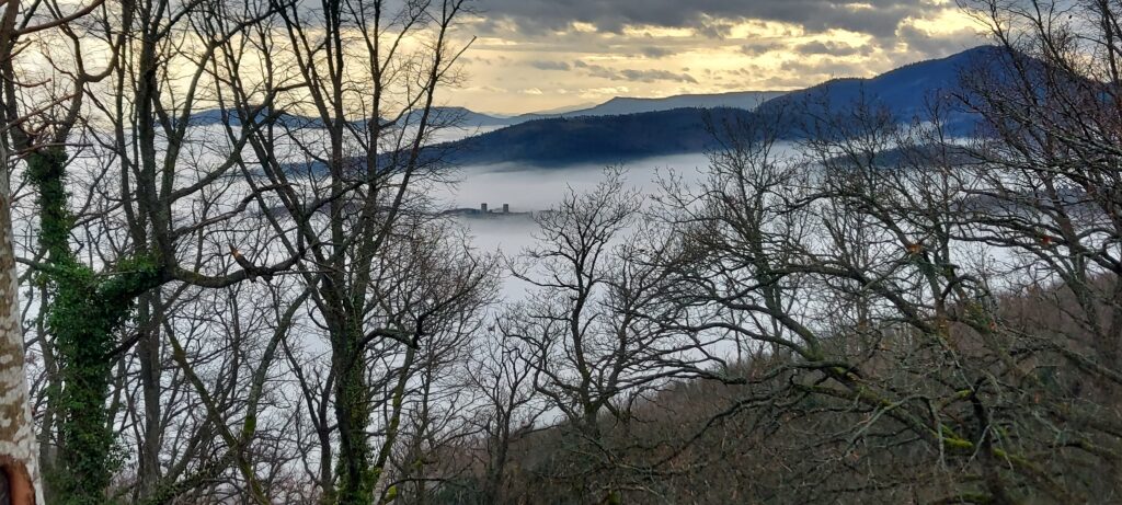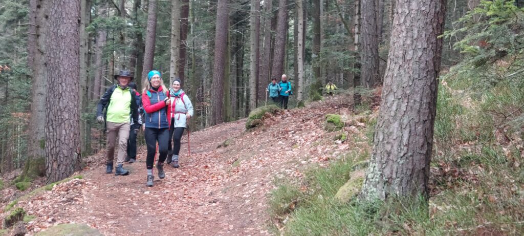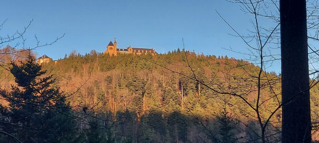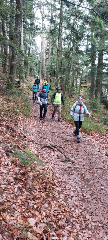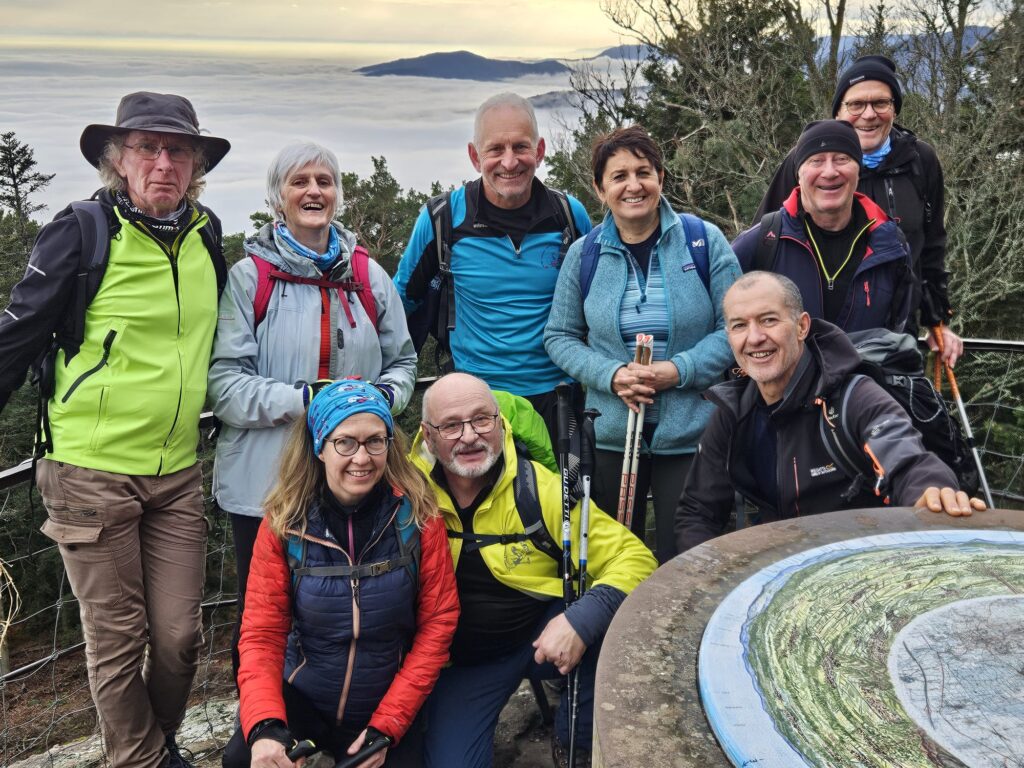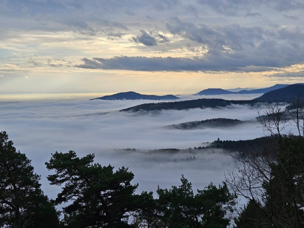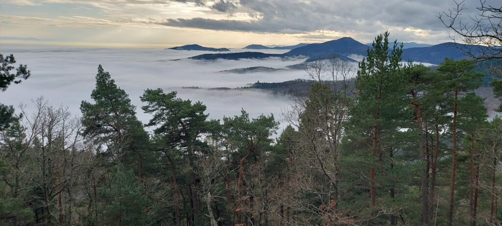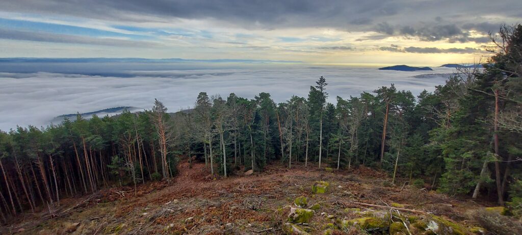 Petits bruits d’estomacs : il est plus de 11 heures. On ne rigole plus, là, Guygues va nous tomber dans les pommes s’il n’est pas attablé dans les temps ! Réfectoire du self au Mont Ste Odile. Vue panoramique sur la plaine d’Alsace. Grandiose. Une fois que le plateau repas est posé et que la mousse a coulé au fond du gosier, les corps se relâchent. Le timing est parfait. Nous avons pu nous mettre tous ensemble à la grande table avant l’arrivée d’un flot discontinu de touristes/pélerins de tout genre. C’est tellement agréable que François est obligé de secouer l’équipe pour entamer le retour afin de terminer le parcours avant la tombée de la nuit : demain c’est le solstice d’hiver, journée la plus courte de l’année et nous n’avons pas prévu de lampe frontale. Nous suivons le mur païen jusqu’au Maenelstein. La boucle sud tout aussi belle, dispose de quelques balcons sur la plaine d’Alsace. Cette dernière est recouverte d’une bonne couche d’ouate dont émergent quelques sommets : la forêt Noire, le Kaiserstuhl, les Alpes Suisses, le Bernstein ou l’Ungersberg. Incroyable de beauté ! La descente se poursuit jusqu’au kiosque Jadelot avant notre dernière pause au château du Landsberg. 16h. Nous sommes arrivés. Ravis !