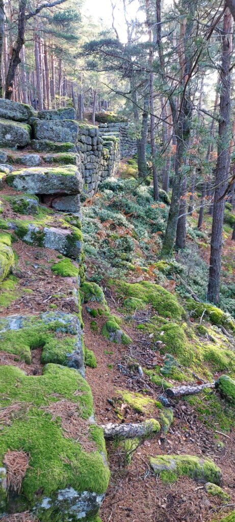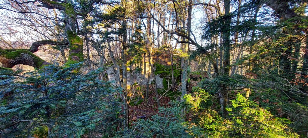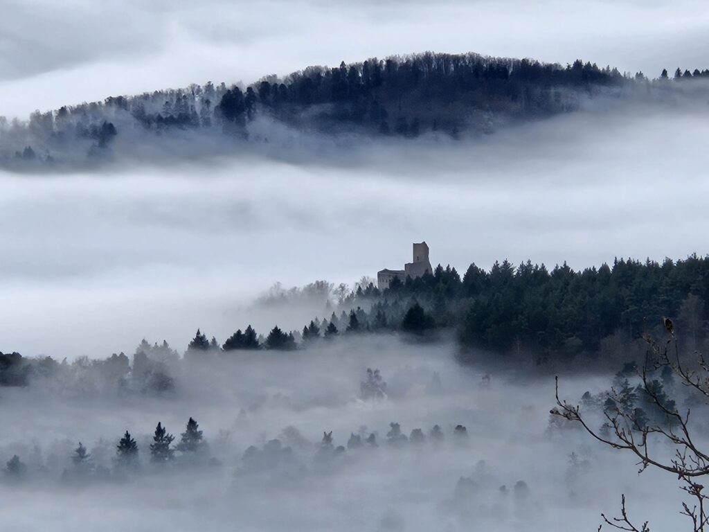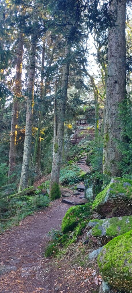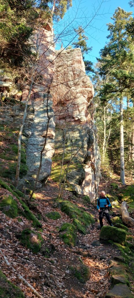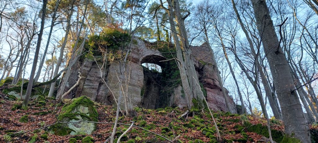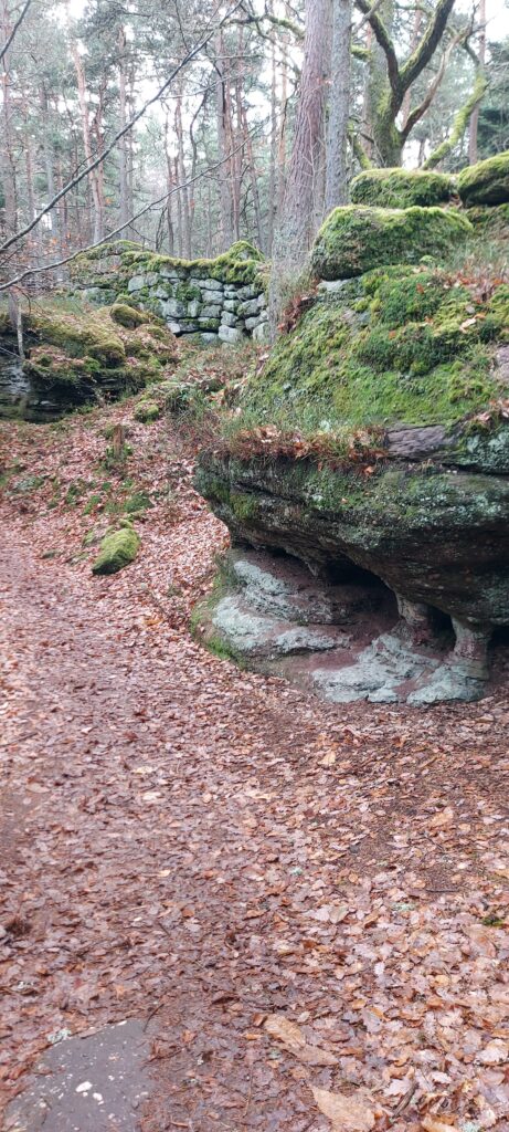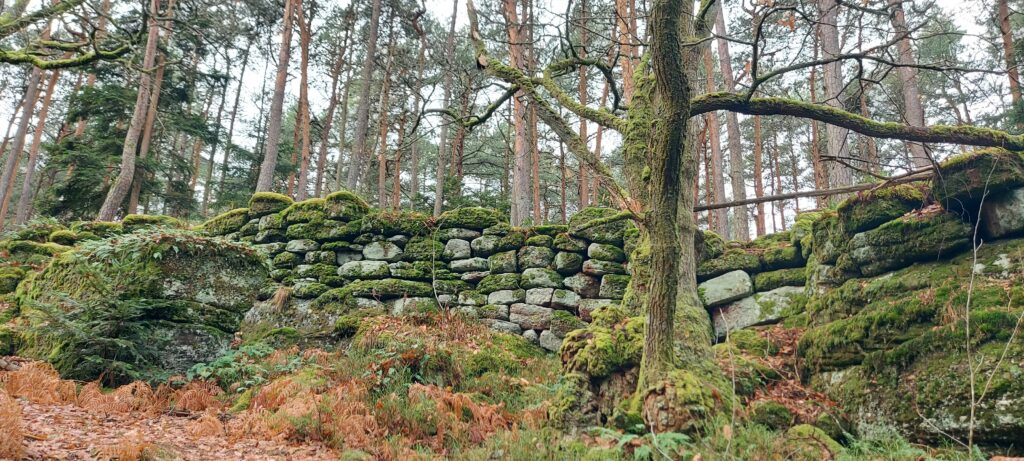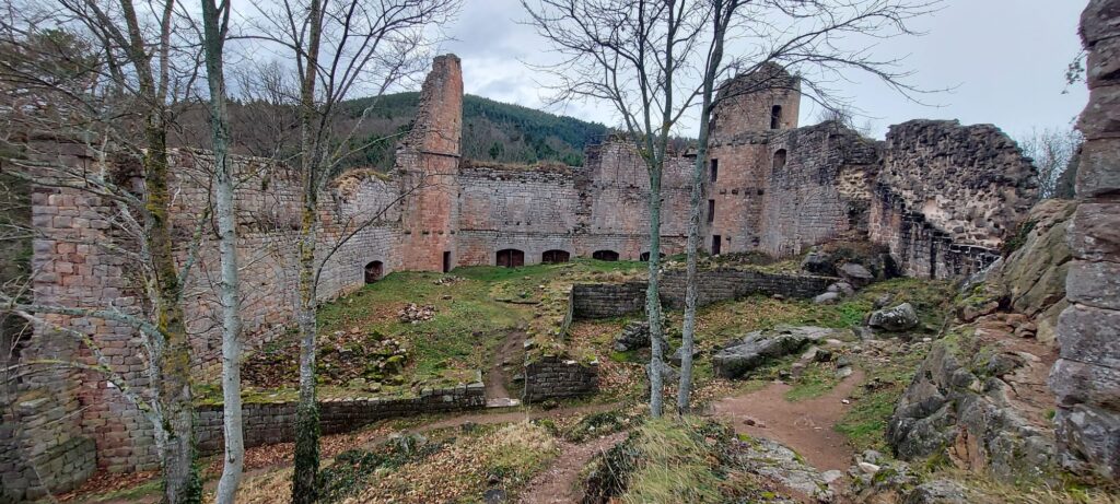 Départ à la ferme de Truttenhausen au petit jour, dans un brouillard qui vous donne envie de retourner à la voiture illico. On ferme donc tout ce qu’on peut fermer : les vêtements, la bouche mais pas les yeux. Et c’est parti ! Le terrain est gras jusqu’à St Jacques où la limite du brouillard est atteinte. Petite pause boisson dans les ruines de la chapelle avant de passer par les ruines de l’abbaye de Niedermunster et de la chapelle St Nicolas. Les chevaux se cachent sous les arbres et attendent patiemment que le soleil fasse son apparition. Il nous faudra croiser le chemin des Pèlerin pour qu’il arrive enfin et que les K-ways disparaissent dans les sacs. Quelques encablures plus loin, nous voici déjà au Hohenburgerberg sur le chemin des merveilles. Nous longeons les hautes dalles de grès avant de remonter vers la porte Nord. Cap à l’ouest, vers le château du Hagelschloss. La descente en pente douce nous amène aux ruines étonnantes de cette fortification à cheval sur deux éperons rocheux, qu’une imposante arche de grès vient surplomber. Prochain objectif, le château du Dreistein. Vous l’aurez compris, il s’agit de 3 moignons de pierre qui racontent toujours la même histoire de riches, un problème d’héritage. On laisse le moyen-âge de côté, et on s’est délecté du mur païen nord qui ne cesse de nous intriguer et d’entretenir ce délicieux mystère autour de son origine et de son utilité. Cette construction noyée dans la mousse au milieu des pins est tout simplement sublime. L’épaisseur du silence y est puissante, régénératrice. On ne s’en lassera jamais.